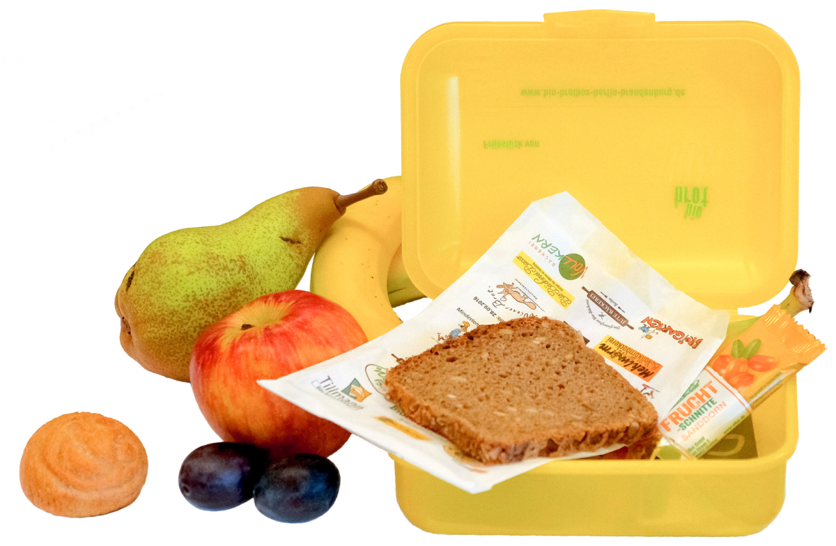 Gefüllt wird die Brotdose mit allerlei gesunden Bio-Lebensmitteln, wie beispielsweise Vollkornbrot, Obst und Gemüse, Fruchtriegeln, Tee, Aufstriche, Haferflocken, Milch oder Jughurt und vielem